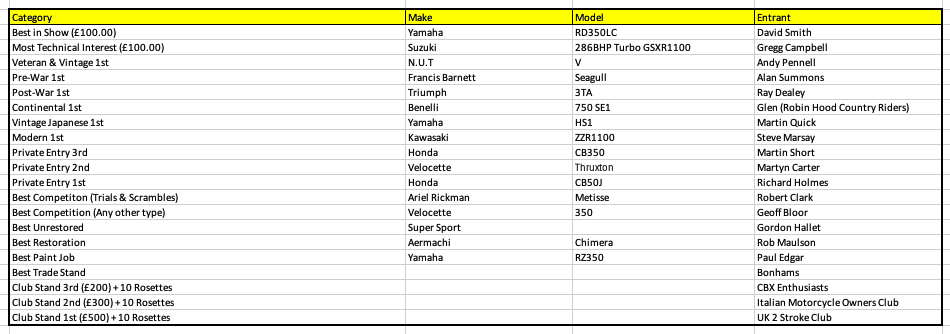 The organisers would like to thank all entrants for bringing their motorcycles to Newark and contributing to the atmosphere and quality of the show, as well as the judges for their time and expertise.